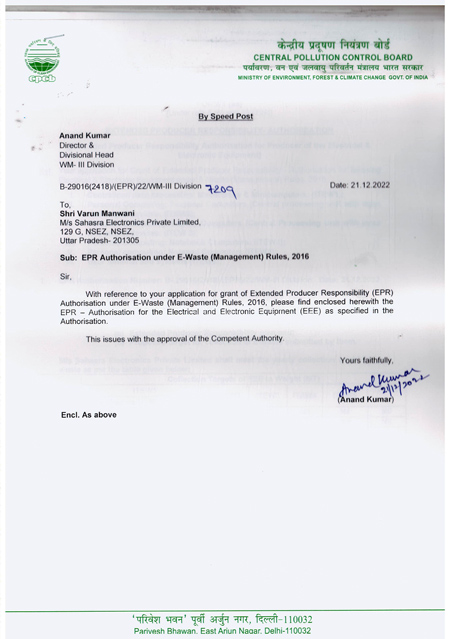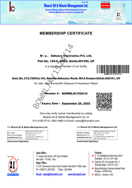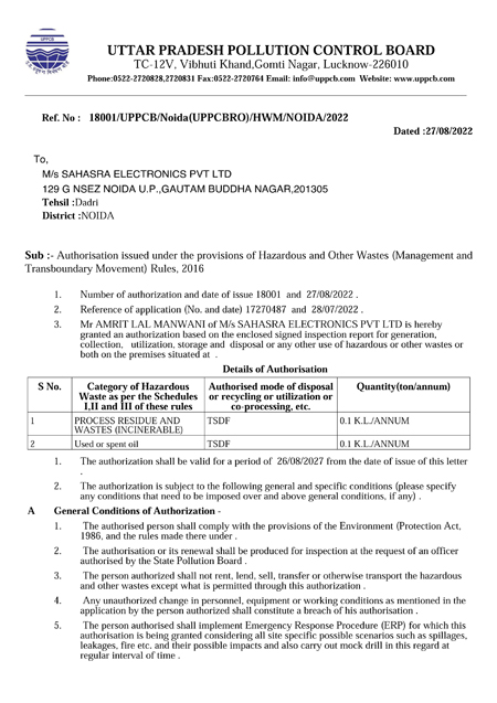 Authorisation certificate for Hazardous Waste Management & Incineration