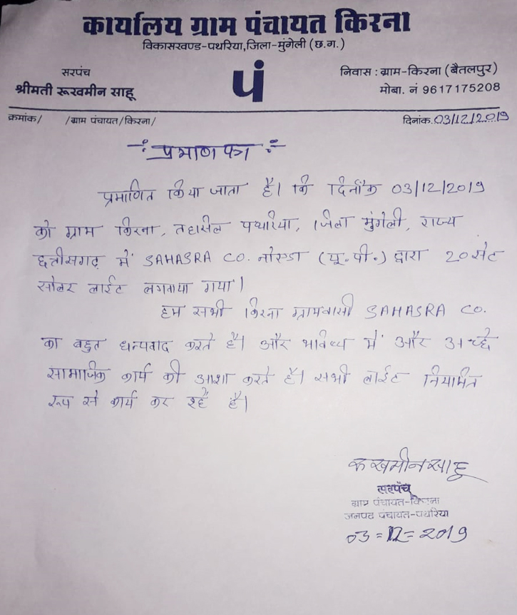 Sahasra Electronics has distributed Solar Street Lights under Corporate Social Responsibility initiative on 03/12/2019 at Mungeli, Chhattisgarh.